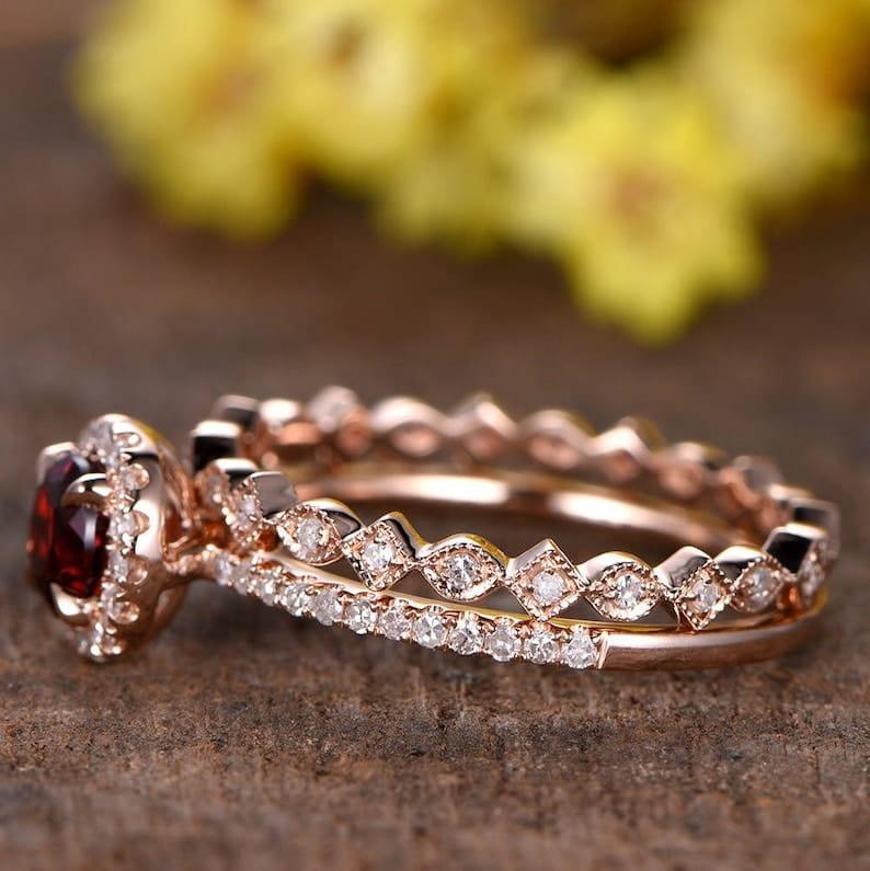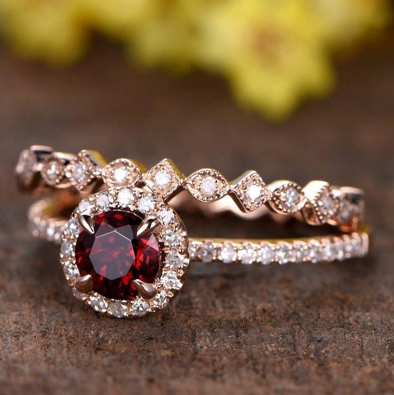 Red Garnet Engagement Bridal Set Band Art Deco Wedding ring