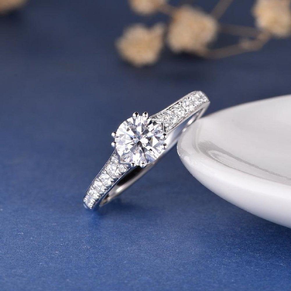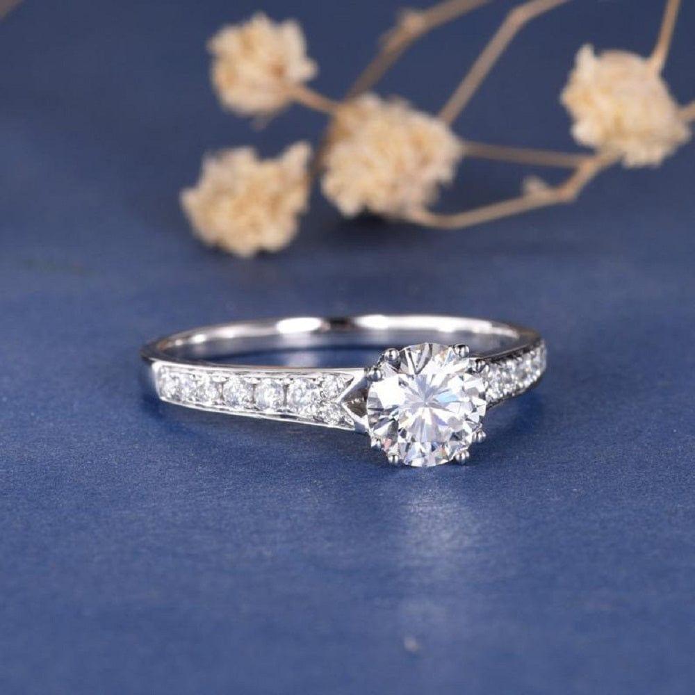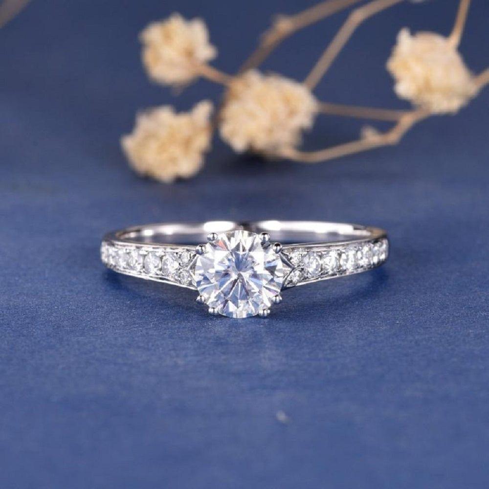 1.00CT Round Cut White Gold Double Prong Pave Set Moissanite Engagement Ring